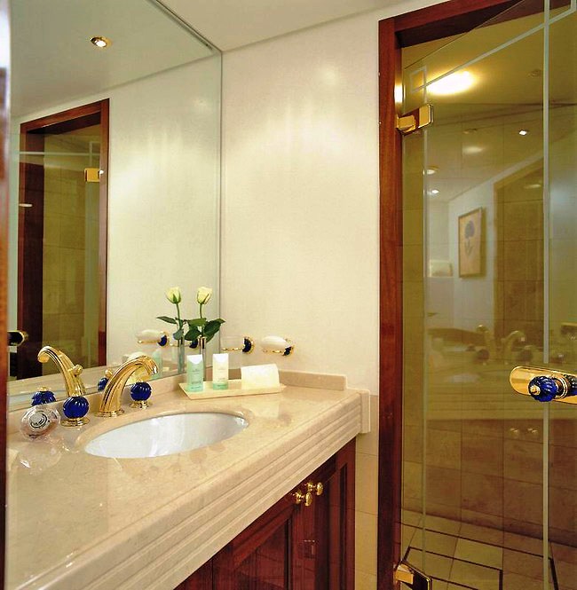 M/Y JASMIN’s main saloon and dining area features elegant refinement with antique armchairs, silk cushions, custom carpets, rich varnished-wood panelling and columns to the spacious teak-laid decks.