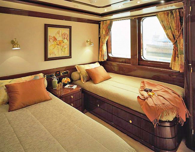 On the upper deck are two VIP cabins with queen-size beds and two twin-bedded guest cabins. The windows in the VIP cabins can be opened, offering the possibility of fresh air at any time.