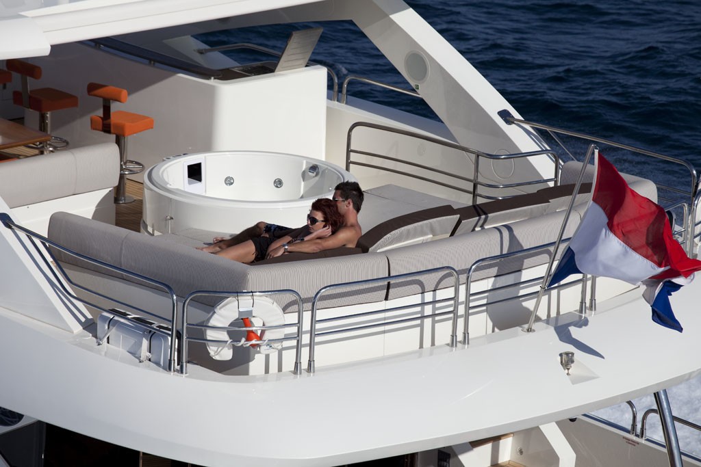Motor yacht OLIALIA can accommodate up to 8 guests in 4 ensuite cabins. The VIP cabin is located on the main deck, and is equipped with en suite bathroom, a lounge area with comfortable sofa, 42” LCD flat screen TV, DVD and CD player.