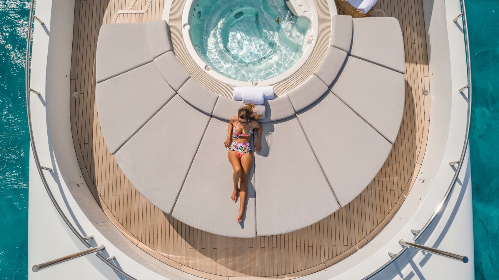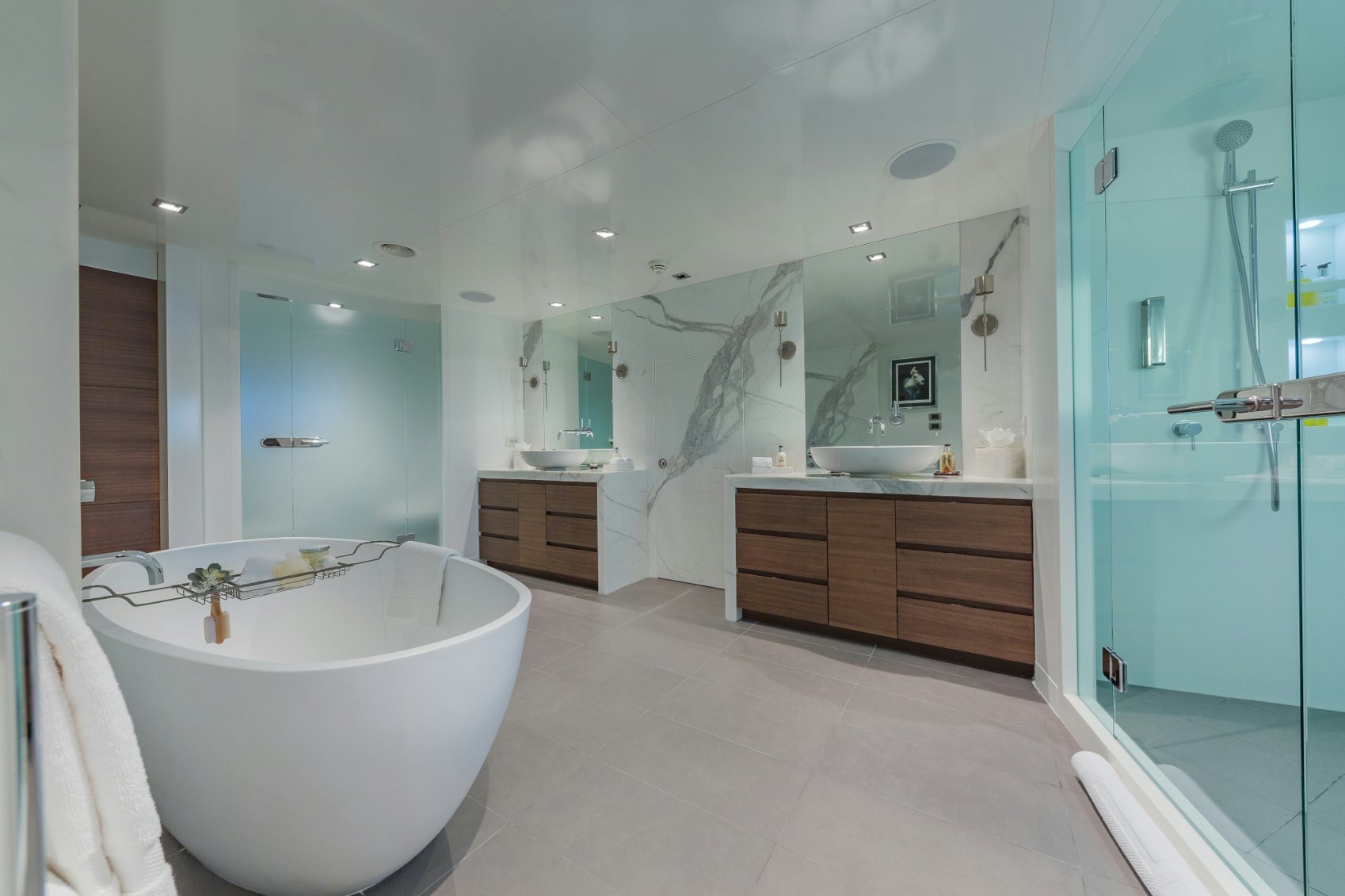 The main deck is a home to a full-beam owner cabin with a large wardrobe and ensuite bathroom with a tub. The lower deck features three queen cabins with en-suite shower rooms, as well as one queen cabin with a Pullman berth and ensuite shower room.