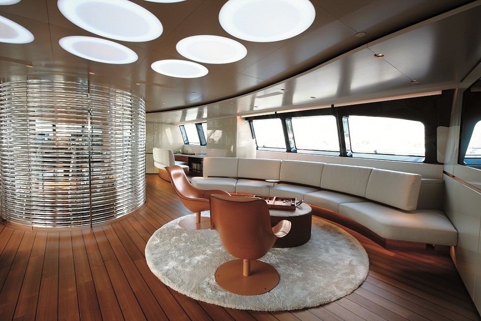 A selection of handmade Paola Lenti furniture was designed for the main deck and the flybridge and achieve her signature dynamic, geometric, yet informal vibe. The flybridge has a BBQ, bar, endless cushions, loungers and awnings ...