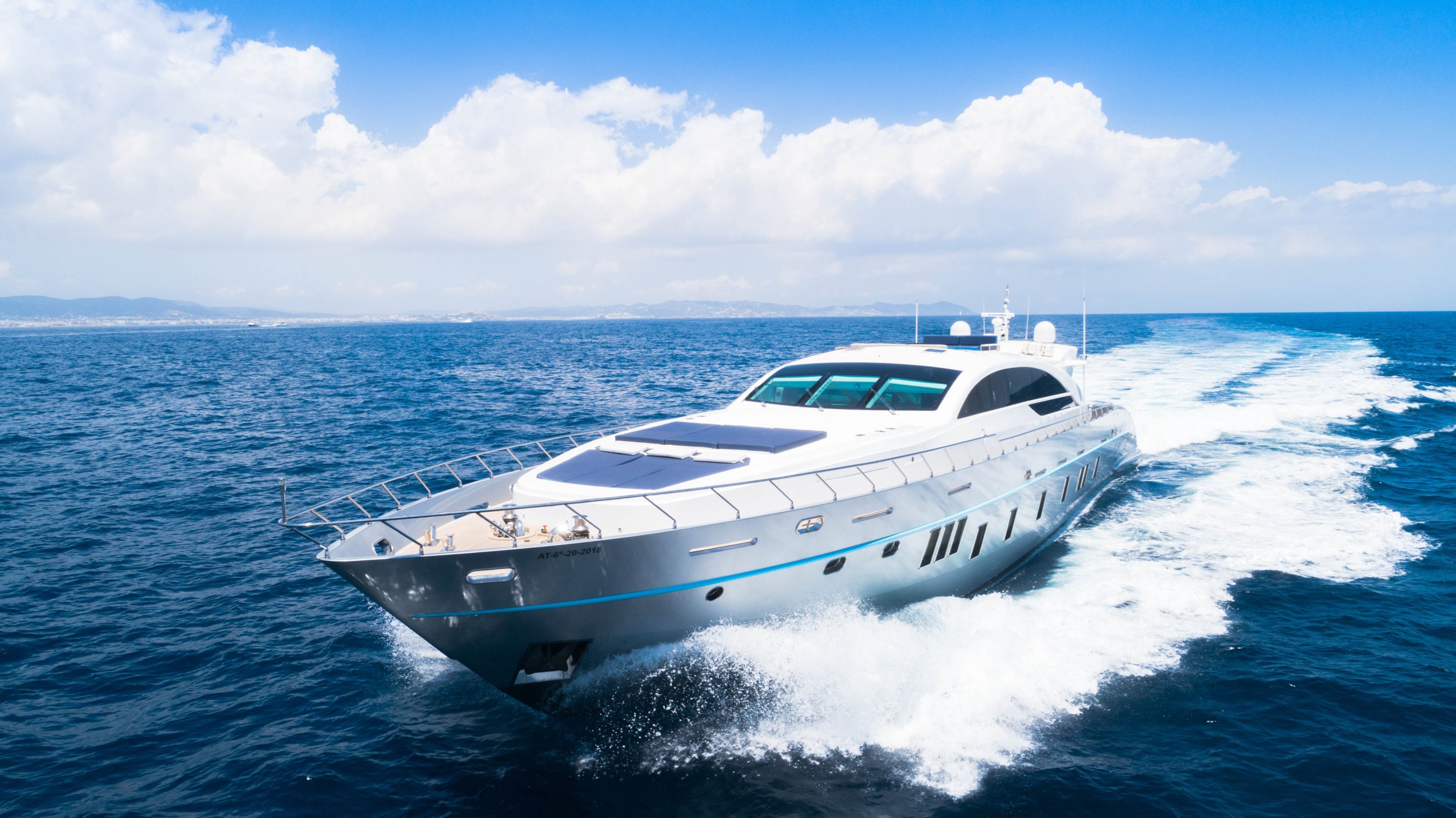 The performance motor yacht boasts twin 4,000 hp MTU engines enabling her to reach at a top speed of around 31 knots and 24 knots as a cruising speed.