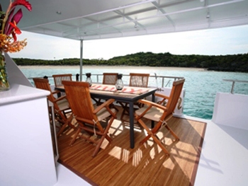 Motor yacht SLUMBER VENTURE boasts a large aft deck which is very spacious thanks to her 26' beam. The aft deck is completely shaded for wonderful alfresco dining both day and night. The aft deck leads down to her swim platform ...
