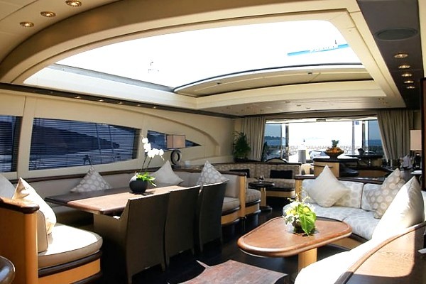 The Mangusta 108 NOBODY has 2 saloons with comfortable sofas, a bar, and a dining table. Gourmet meals from the chef can be served in the elegant dining area, or outside under the stars.