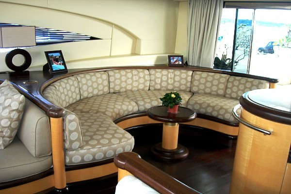 The Mangusta 108 NOBODY has 2 saloons with comfortable sofas, a bar, and a dining table. Gourmet meals from the chef can be served in the elegant dining area, or outside under the stars.