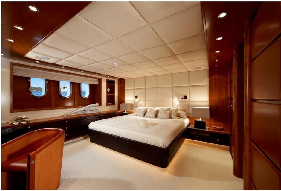 With steel hull and aluminium superstructure, motor yacht MAXIMUS also features twin Caterpillar C 18 DITA engines and zero-speed stabilizers, and is built to Lloyd's Register Class and MCA Certification. She can cruise at a speed of 12 knots and attain a maximum speed of 13 knots.