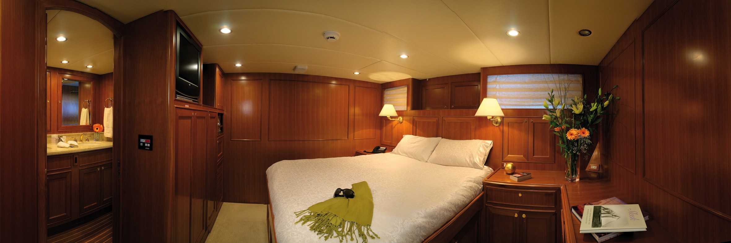 Motor yacht SUNDENE has a generous volume with a 6,50m (21' 3") beam. Her elegant main salon features a lounging area to port and further forward there is a bar to port and a dining area to starboard. The panoramic windows present beautiful views out onto the azure sea and beyond.