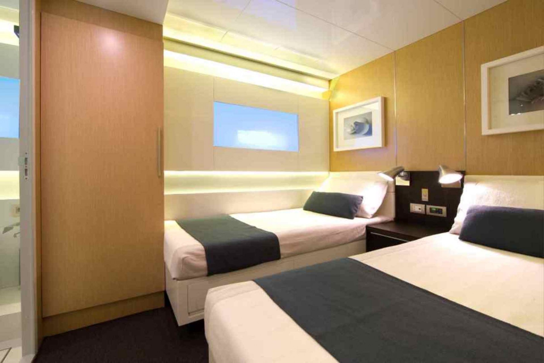 The room is unusually large with a stunningly beautiful en suite head. The large VIP cabin forward is fitted with a double bed. And there are also two more twin cabins. The bow of the yacht offers space for crew, which can be accessed through a hatch underneath the forward sun pads.