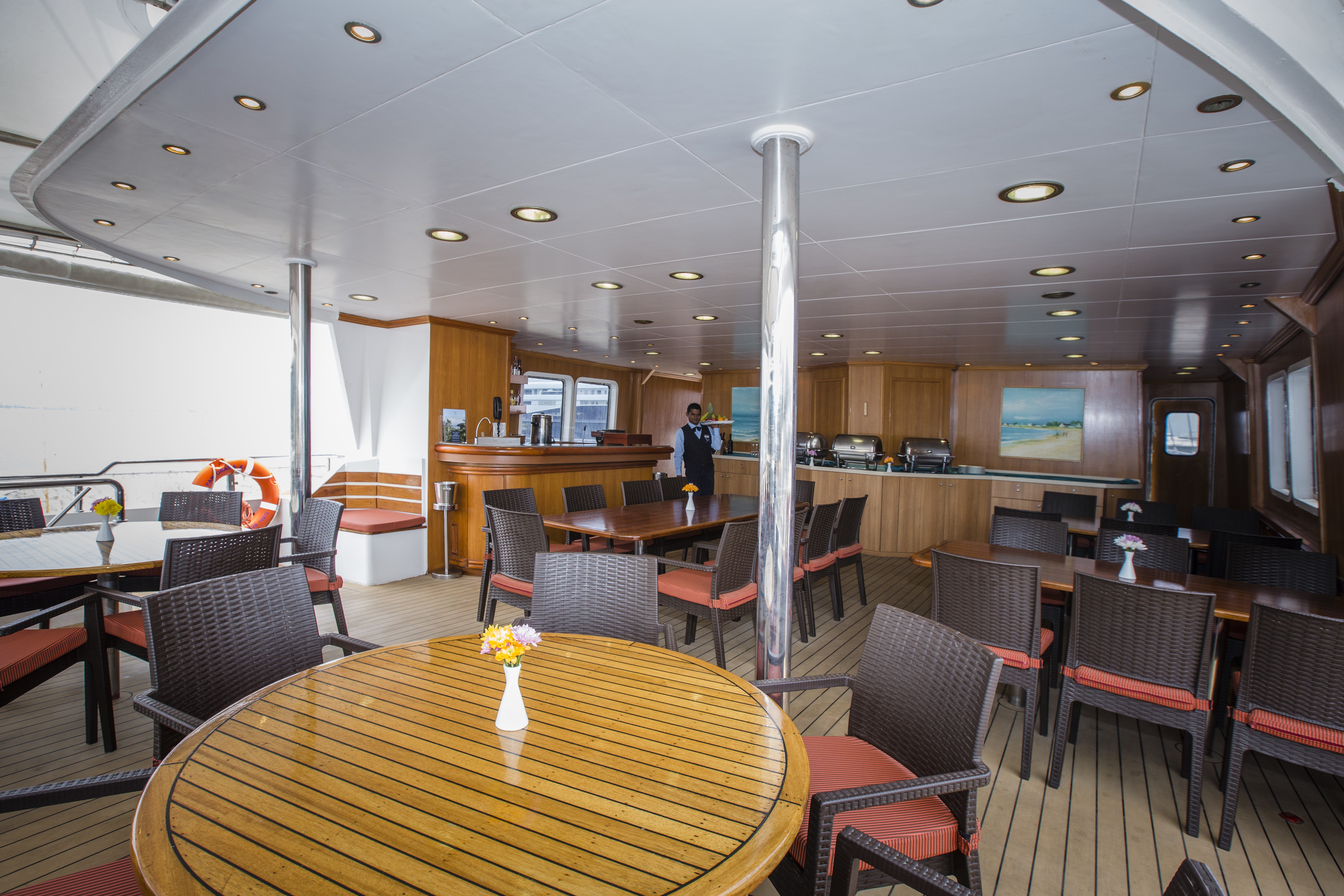 Guests have access to a main salon with plush seating on the main deck aft with a reception area and a bar area. The main deck lounge provides intimate surroundings to relax at any time.
