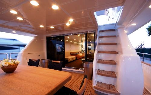 Further forward is the dining area opposite the open stairs leading to the upper deck. The stairs are lined with a blue light adding an incredible ambience to the room. M/Y LARMERA features modern artwork and pieces throughout.