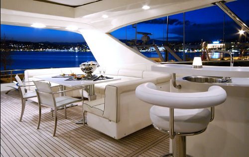 The hard top on LARMERA’s fly bridge provides shade whenever it is needed and with a push a button and the canopy slides open to allow unforgettable moments under the stars.