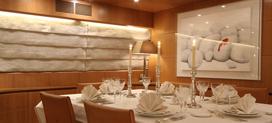 The adjoining dining table is located just forward of the salon. The intermediate sized dining table seats nine guests to be served by the highly professional and humble crew. The galley is located just forward of the dining area where the chef discretely prepares delightful cuisine.