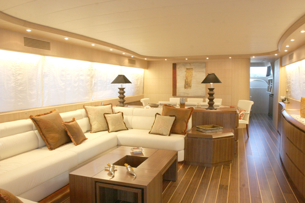It is through these doors you enter the vessels luxurious main salon. It has a comfortable semi circular connecting sofa and an additional 2 seater couch in a sugar coloured fabric. On the starboard side of the salon is a large T.V screen of the latest technology which is stylishly placed on the wall for your ultimate viewing.