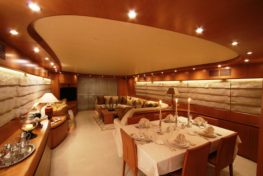 It is through these doors you enter the vessels luxurious main salon. It has a comfortable semi circular connecting sofa and an additional 2 seater couch in a sugar coloured fabric. On the starboard side of the salon is a large T.V screen of the latest technology which is stylishly placed on the wall for your ultimate viewing.