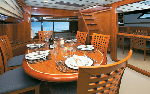 Equally elegant and relaxing are the two dining areas on the main deck and flybridge respectively, where a choice can be made between indoor or an alfresco dining.