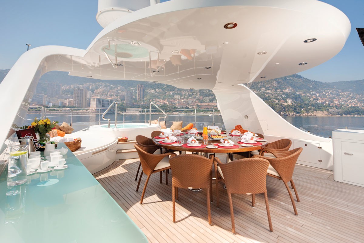 Additional features include a large sun deck with a Spa Pool and wet bar, a rescue boat stowed on the main deck forward, and conning from the wheelhouse or bridge wings on the upper deck.