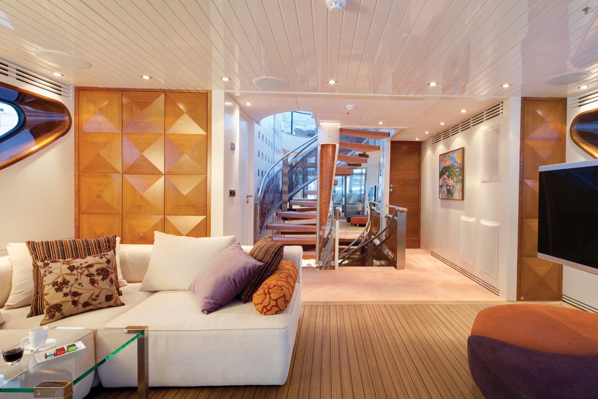 (see photos) This allows a column of daylight to fill the yacht’s heart and provides natural light to the main and bridge deck saloons that are already surrounded by windows and doors on three sides.