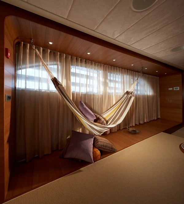 The bridge deck salon features bright sunny colors and decorative pillows set off by Moonen’s carefully executed joinery.
