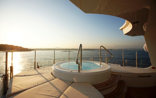 Additional features include a large sun deck with a Spa Pool and wet bar, a rescue boat stowed on the main deck forward, and conning from the wheelhouse or bridge wings on the upper deck.