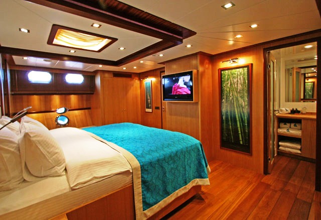S/Y GETAWAY is able to accommodate up to 8 guests in 4 staterooms. The cabin configuration consists of a master cabin with a Californian King size bed, a TV and entertainment system with air conditioning and a private en-suite.