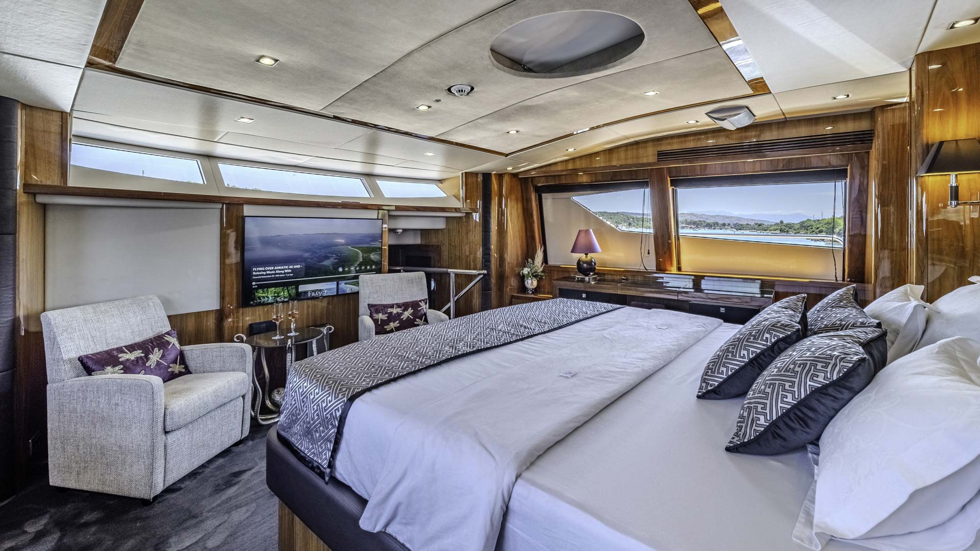 The master stateroom features a walk-in wardrobe, ensuite facilities and fantastic 180-degree visibility. There are also two VIP and two twin cabins.