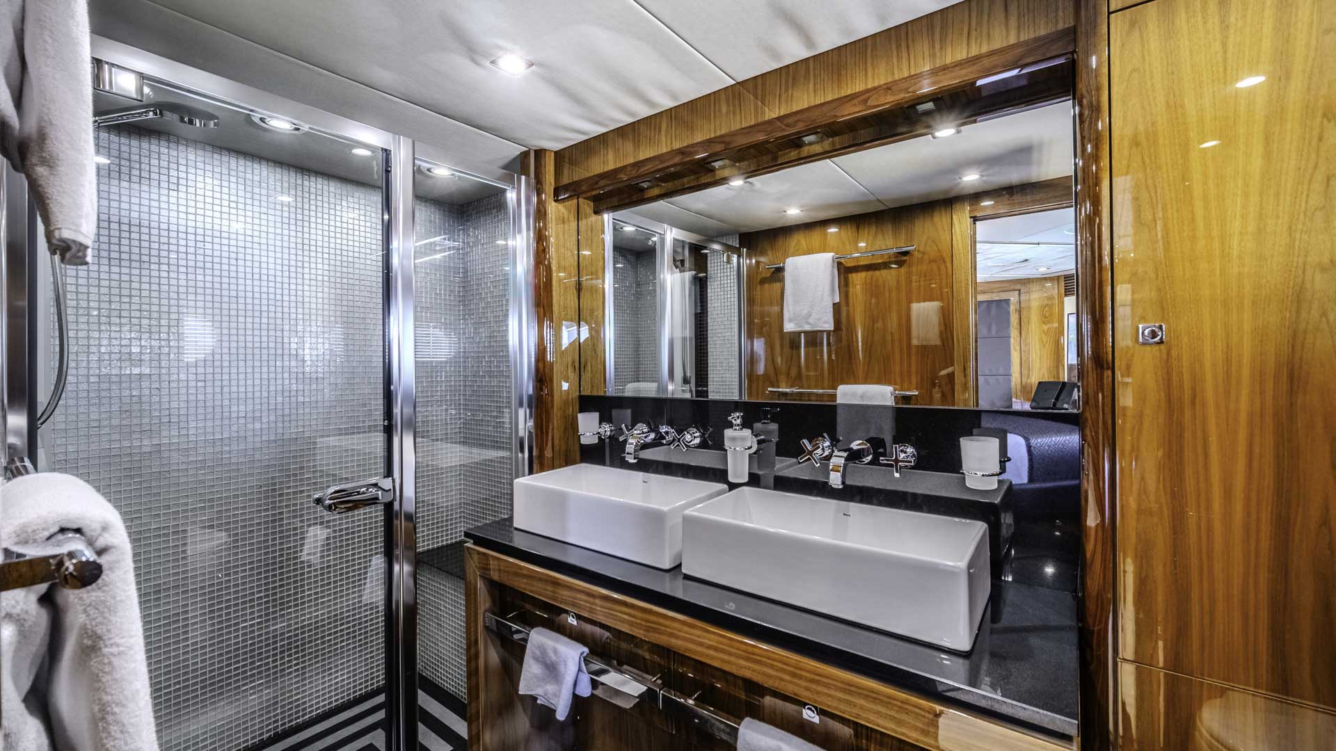 The master stateroom features a walk-in wardrobe, ensuite facilities and fantastic 180-degree visibility. There are also two VIP and two twin cabins.