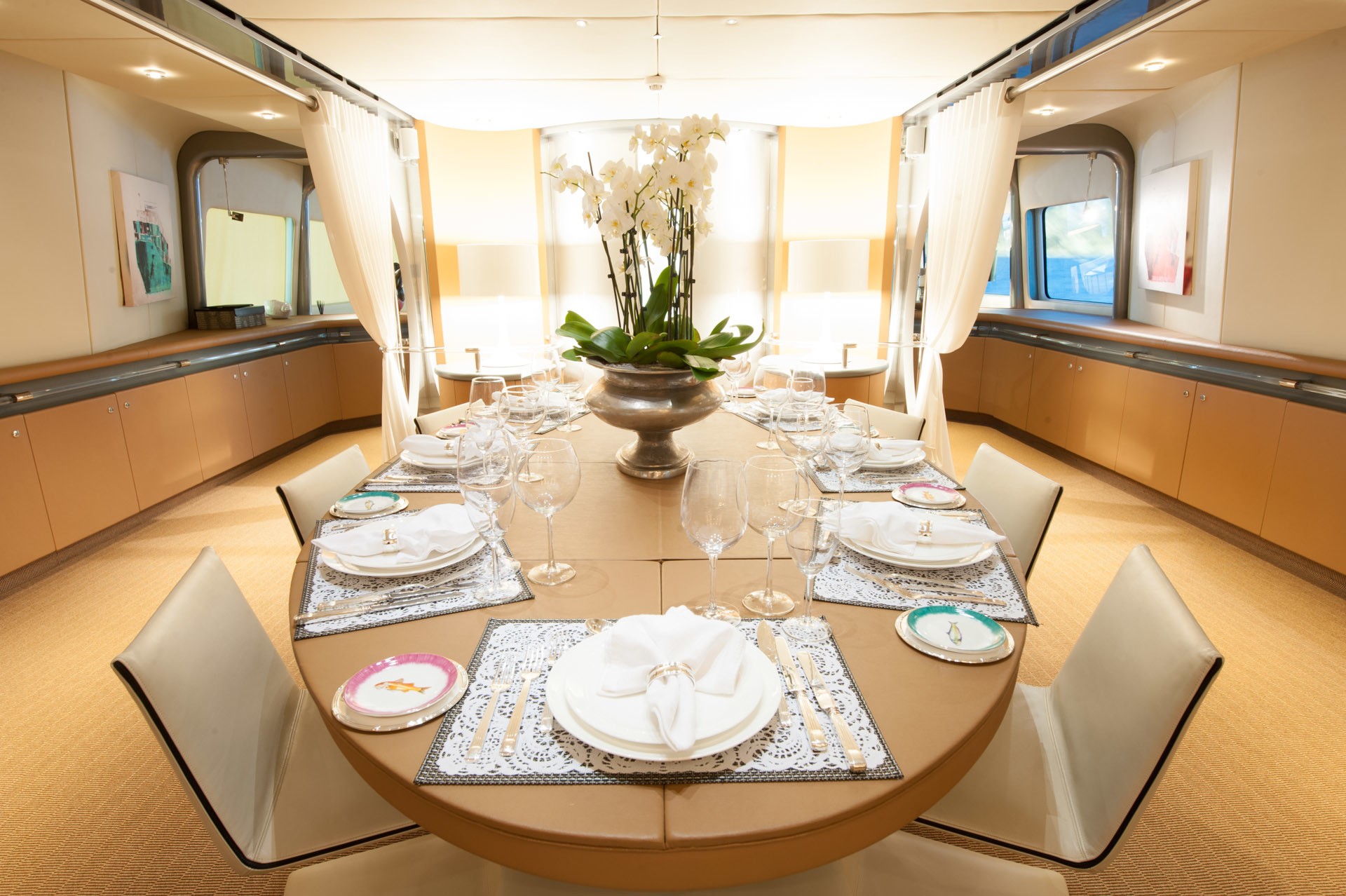 Her modern salon is comfortable yet ultra modern with low couches to port and starboard and a central stairway forward that is a striking and prominent feature. The stairwell from the main salon incorporates a charcoal burled wood veneer, stainless and Lucite handrails.