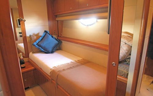The port guest cabin has 2 single beds- most suitable for children and equipped with 15” flat screen TV. CD/DVD player runs from salon. This twin cabin shares the shower room/day head. The starboard guest cabin is equipped with a double bed (150x200) and an ensuite shower bathroom. The guest cabin has a 15”flat screen TV.