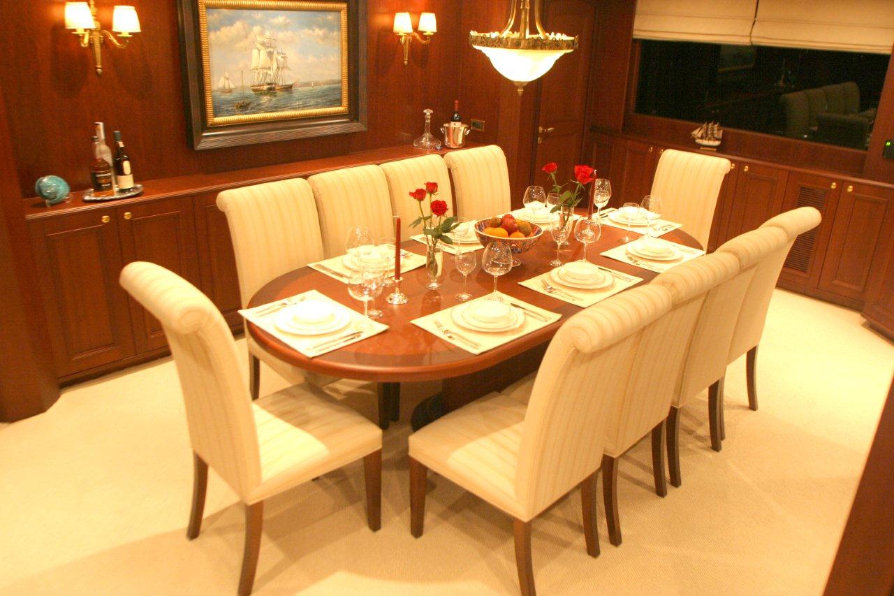 The salon and dining area are separated by a central wall that houses the huge flat screen TV. The elegant dining table has room for up to 10 guests.