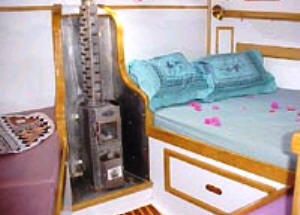 There are two large private cabins with double berths and four single berths spread throughtout the yacht. There is one head with a walk-in shower on board and an additional deck shower on the upper sides.