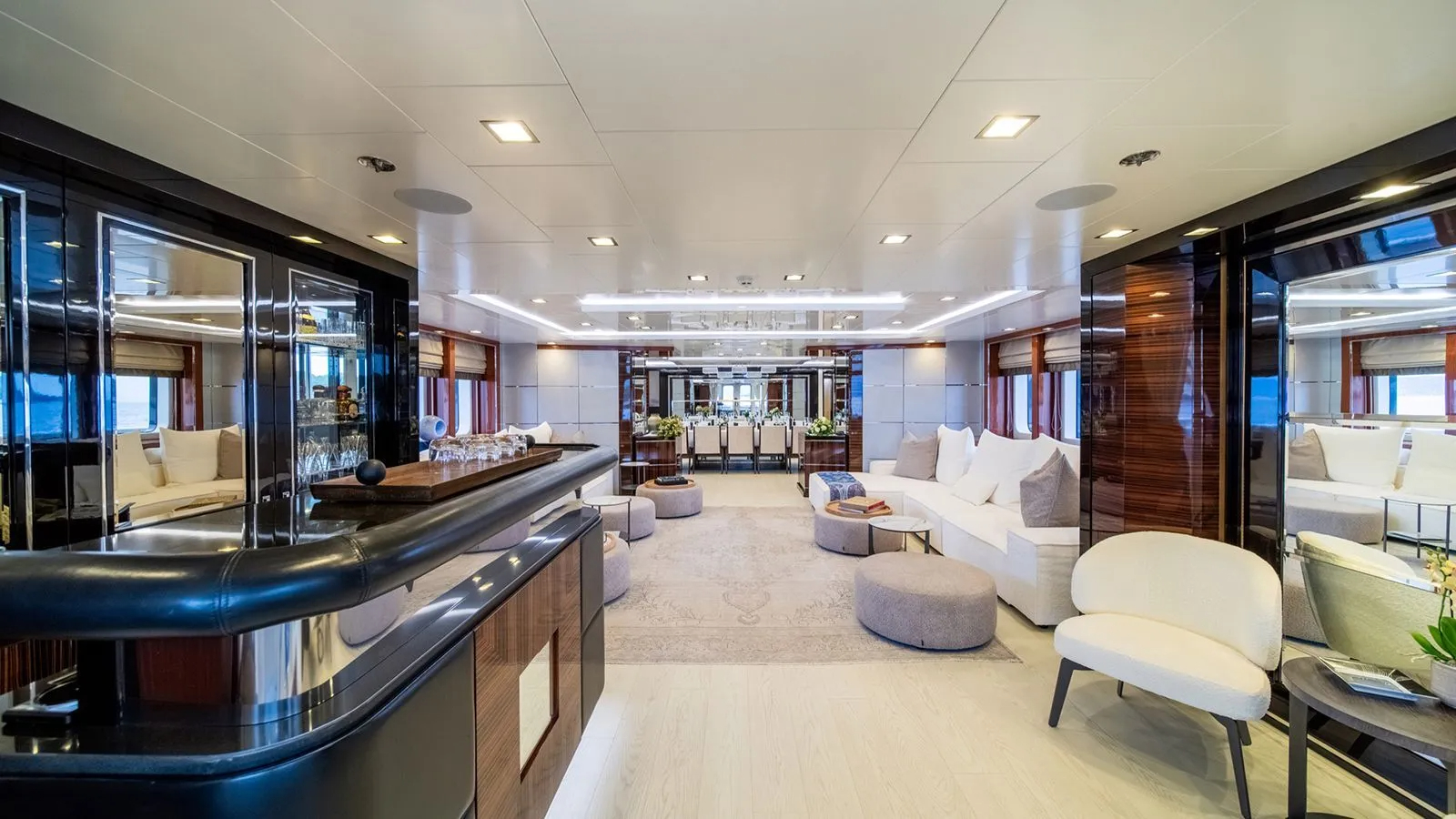 The master cabin is located forward on the main deck and spans the full width of the yacht featuring a King sized bed and separate office. The full-width marble bath has a tub and shower, double vanity and private room with commode and bidet. There are a phone and a TV in the bathroom.