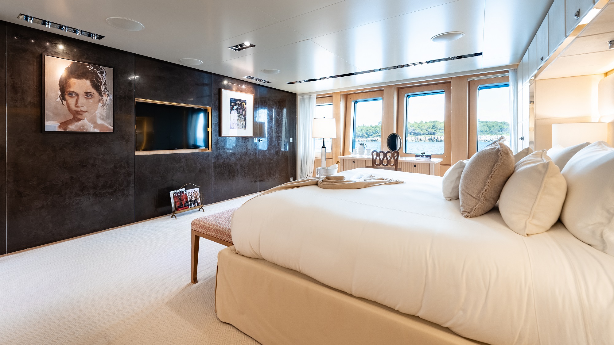 On the main deck forward is the master stateroom, boasting a full beam layout, king-size bed, easy access to the upper observation lounge and study and a large ensuite with a luxurious custom tub. The master cabin benefits from ...