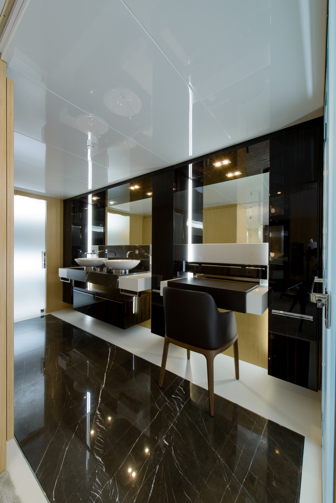 The owner’s cabin is spectacular and located aft. The room is exceptionally large, and features a beautiful modern bathroom.