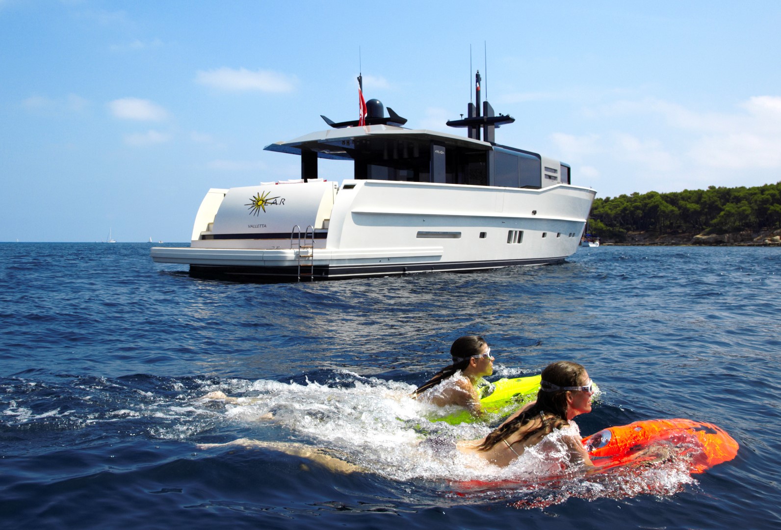 She is described as a floating villa. She boasts a revolutionary “long-cockpit” which enables different internal areas and provides ample volume and generous deck space. She is also very unique in styling and appearance and is sure to turn heads and impress every port or bay you enter. She offers more than just amazing design and styling.