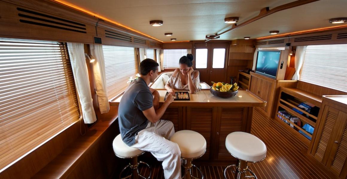 The main salon features a settee to Starboard with occasional chairs to port. Further forward on the port side, there is a built-in hidden sink, fridge, and icemaker. On the starboard side, there is a bar with stool seating for 3. The entertainment system in the main salon features a 50” retractable TV/DVD and an iPod docking station.