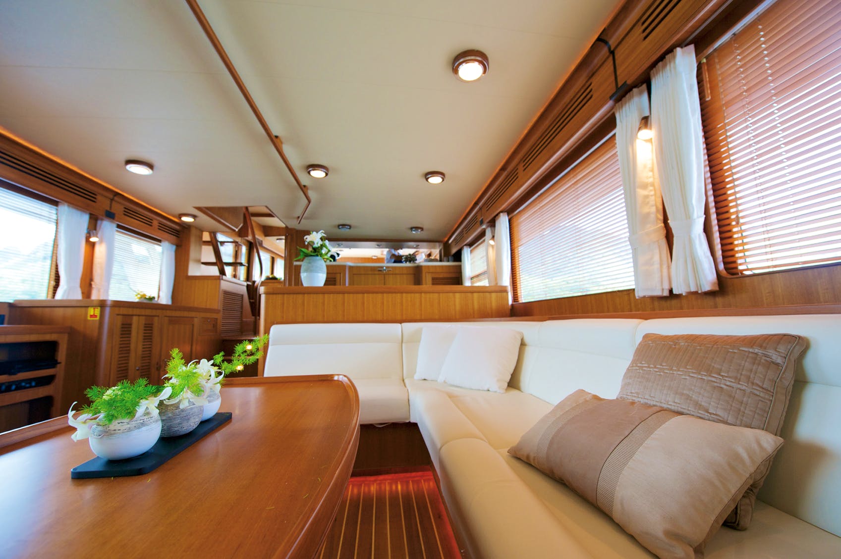 MISS KULANI has a beautiful interior featuring a Holly teak flooring throughout. The main deck is open, airy, and light. The main salon features a settee to Starboard with occasional chairs to port. Further forward on the port side, there is a built-in hidden sink, fridge, and icemaker.