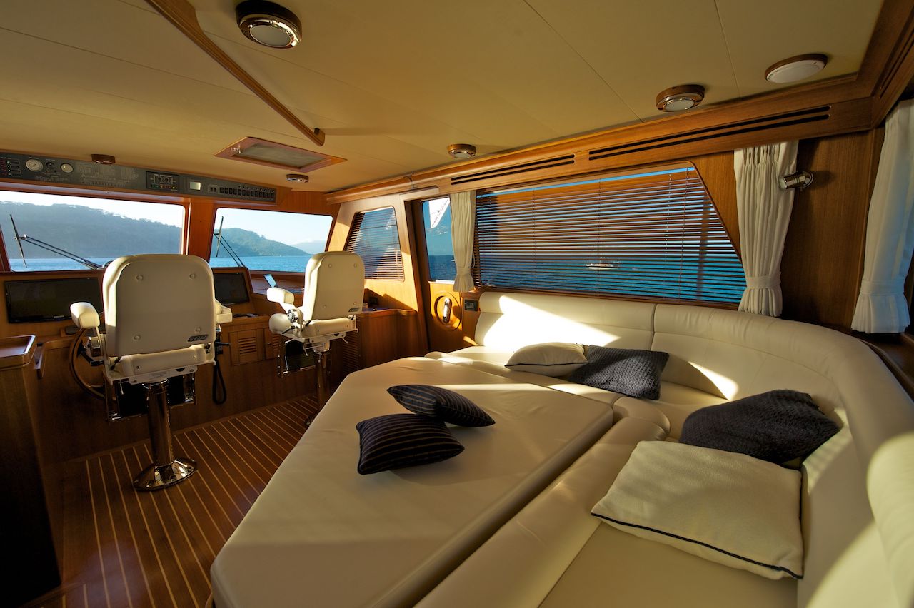 MISS KULANI has a beautiful interior featuring a Holly teak flooring throughout. The main deck is open, airy, and light. The main salon features a settee to Starboard with occasional chairs to port. Further forward on the port side, there is a built-in hidden sink, fridge, and icemaker.