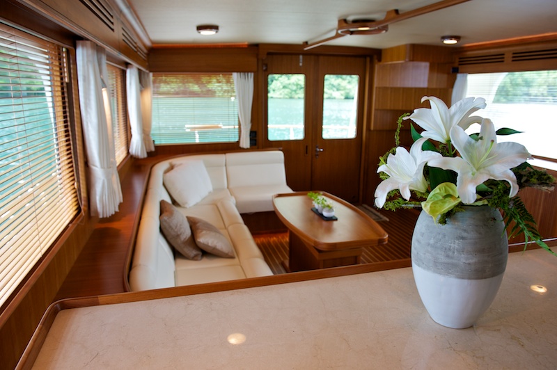 The main salon features a settee to Starboard with occasional chairs to port. Further forward on the port side, there is a built-in hidden sink, fridge, and icemaker. On the starboard side, there is a bar with stool seating for 3. The entertainment system in the main salon features a 50” retractable TV/DVD and an iPod docking station.