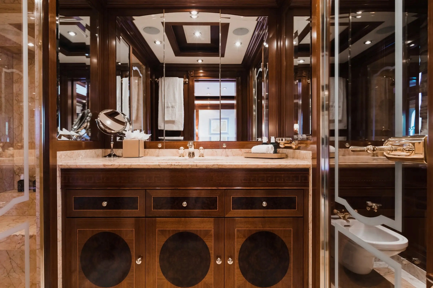 The main deck highlights include the formal dining area and the massive owner’s stateroom.