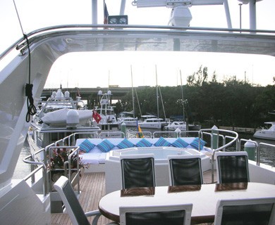 Flybridge Deck: Open with bimini top, dining for 8, large sunning lounge chairs, wet bar with sink, refrigerator and icemaker, BBQ, 6 person Spa Pool, helmstation. The upper deck on Lady J provides ample space to bask in the sun, soak in the Spa Pool or simply take in the sea air and while away the days.