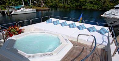 The Fly bridge Deck is open with bimini top, and offers dining for 8, oversized individually reclining sun beds, a wet bar with sink, refrigerator and icemaker, BBQ, as well as a 6 person Spa Pool and helm station. The upper deck on Lady J provides ample space to enjoy the panoramic views and the warmth of the sun.