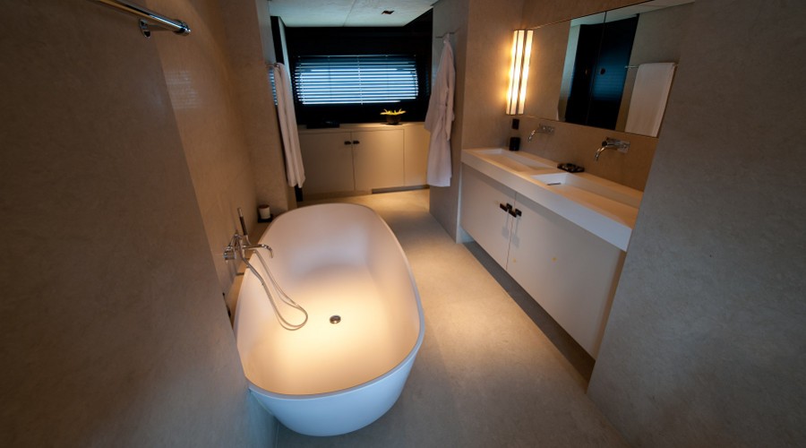 The main deck boasts an open plan lounge and dining, with the dining aft and lounge forward, a wet bar compliments the space and is ideal for entertaining. Forward of the salon lounge and dining, is the full-beam master stateroom with king-size bed, seating, vanity and full beam en-suite, with deluxe freestanding tub.