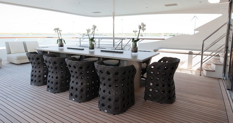 The main deck boasts an open plan lounge and dining, with the dining aft and lounge forward, a wet bar compliments the space and is ideal for entertaining. Forward of the salon lounge and dining, is the full-beam master stateroom with king-size bed, seating, vanity and full beam en-suite, with deluxe freestanding tub.