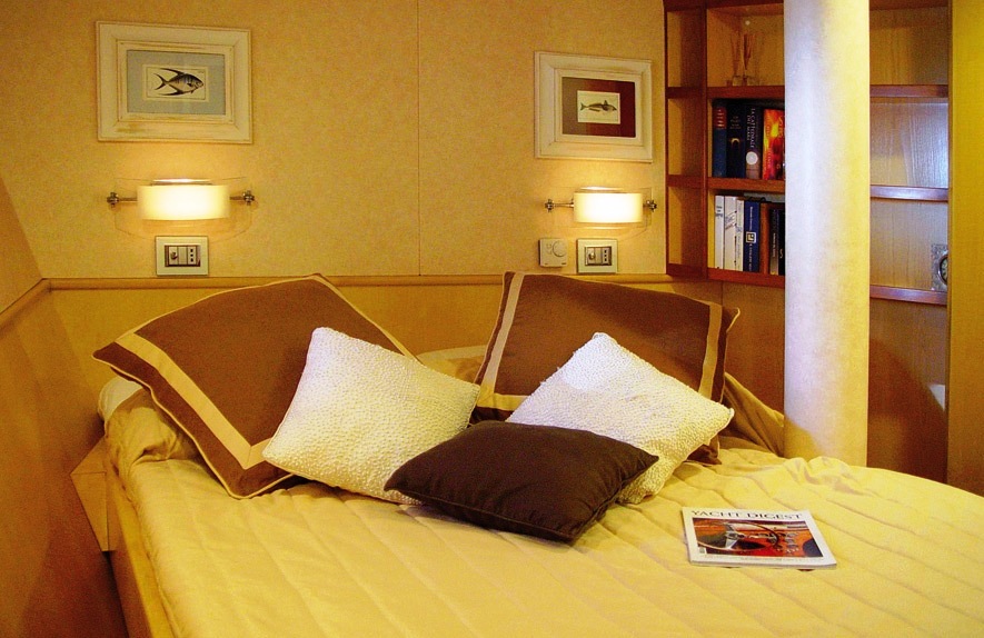 The cabins located below deck consist of 3 twin cabins and 2 double cabins, each complete with en-suite bathroom and Teuco hydro massage shower, plasma television, air conditioning and telephone.