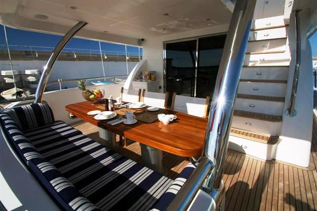 With its amidships master and great VIP stateroom located aft it's like having two masters. She has a spacious aft deck with fixed seating and al fresco table, a huge swim platform ideal for fishing and water sports a fantastic sun deck with sunpads and another al fresco dining table.