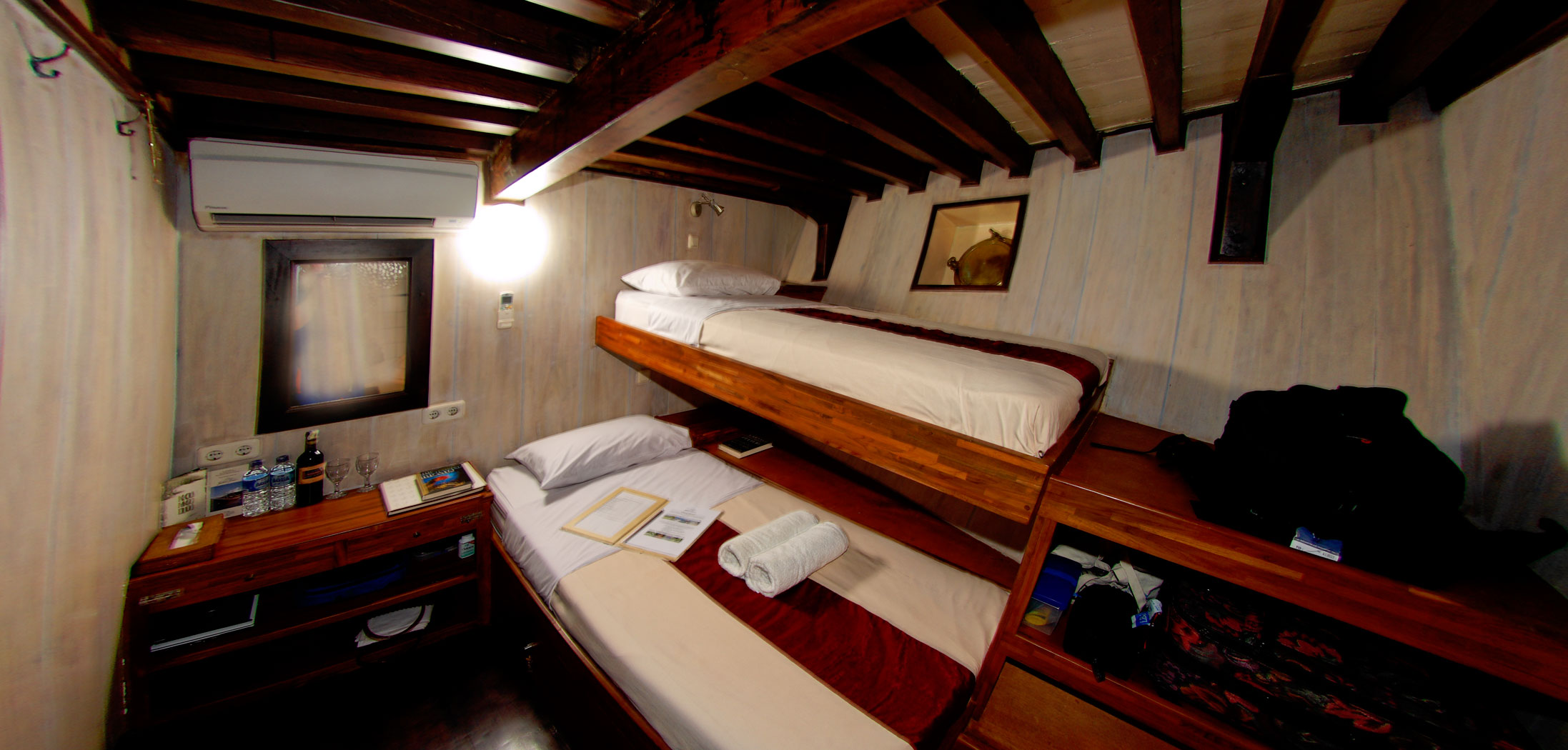 Beautiful and functional teak furniture in the main lounge and cabins, and multiple shaded lounging areas on the upper deck ensure an extremely comfortable cruise.