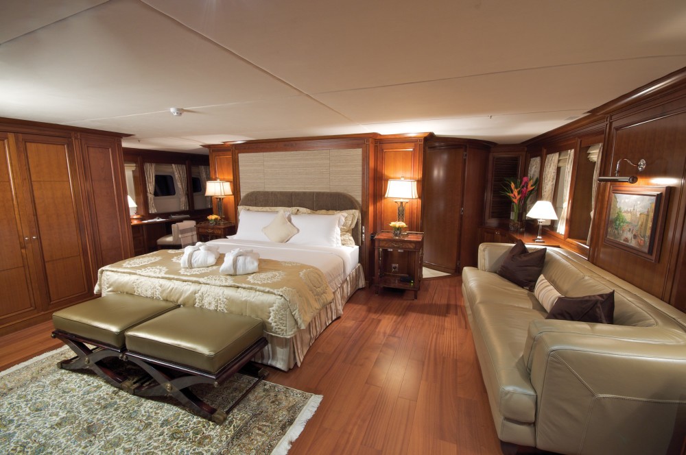 Motor yacht YOU & ME can accommodate up 12 guests in 5 staterooms including a Master cabin with a king size bed, bath tub and toilet, 2 Guest cabins with a queen size bed, shower and toilet and 2 Guest cabins with twin beds, a pullman bunk, shower and toilet. Motor yacht YOU & ME’S crew of 9 are accommodated separately.