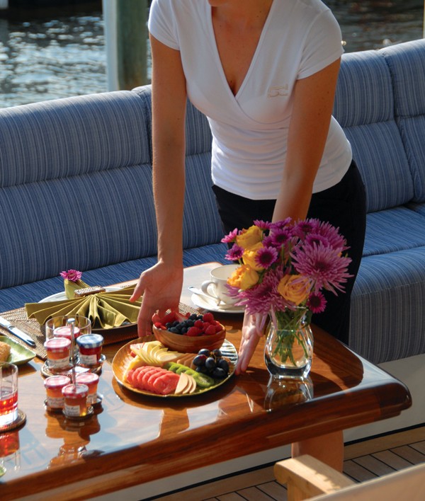 Along with a new modern interior, the motor yacht offers 3 levels of fantastic deck space, including plenty of al fresco dining areas, sunbathing areas and a spa pool on the top deck! She also offers a great selection of water sport toys and a cruising speed of 18-26 knots.