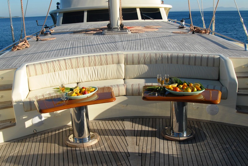 There is another large shaded al fresco dining table on the aft deck. Up forward there is an inbuilt couch and 2 tables – the perfect spot for breakfast or an evening cocktail.
