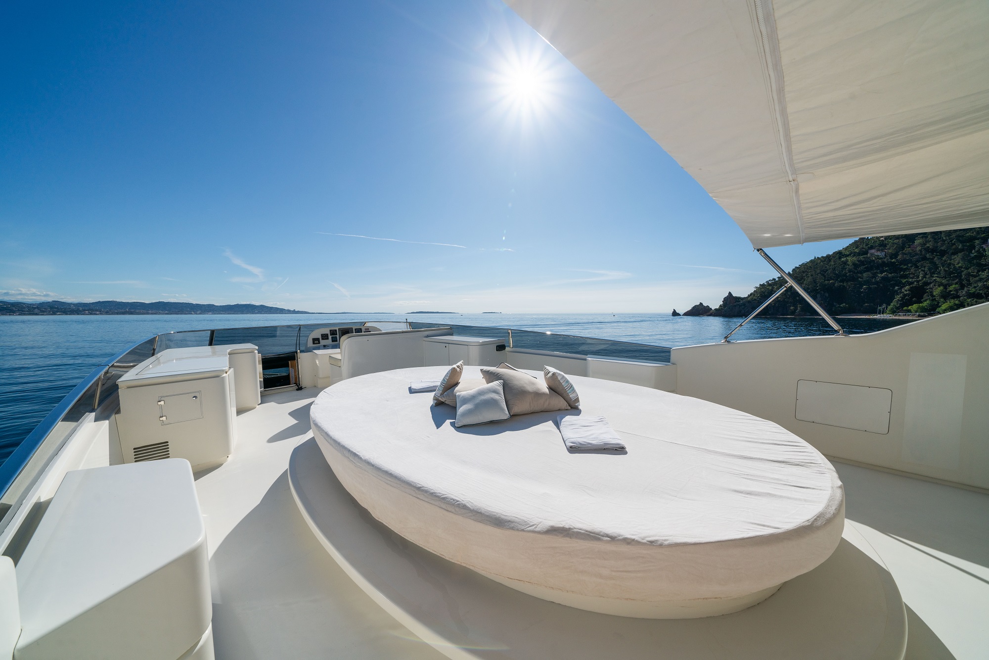 There is a formal dining area forward of the salon along with al fresco dining on the flybridge and aft deck.
